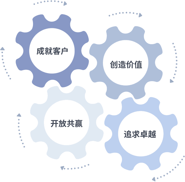 成就客户是一切决策的出发点,,,,创造价值是衡量所有工作的标准,,追求卓越是我们做事做人的态度,,,开放共赢是我们的格局也是最终的结果。。价值观的齿轮环环相扣,,,,推动着组织里的每个人不断向前。。